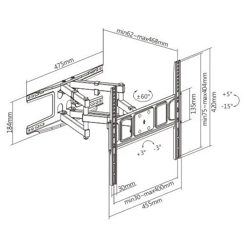 Угол наклона кронштейна: +5°~ -15°