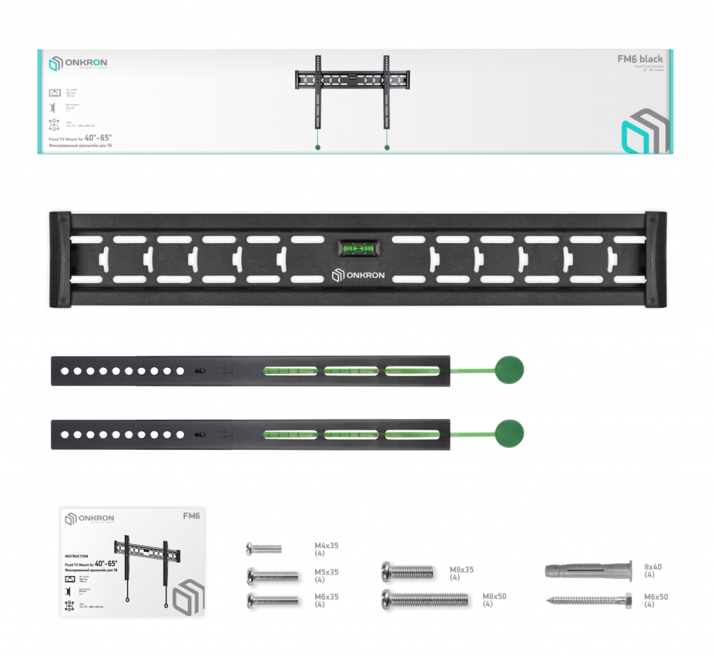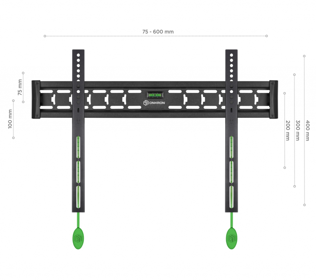 Благодаря встроенному в корпус уровню вы легко, ровно и быстро закрепите кронштейн на стене. Система «Просто щелчок» позволит вам легко подвесить телевизор. Основу нужно прикрепить к стене, а направляющие — к телевизору, затем навесить направляющие вместе с телевизором на основу и прижать до характерного щелчка. Телевизор надёжно зафиксирован благодаря механизму-защёлке на направляющих. Когда надо будет снять телевизор или произвести подключение дополнительных проводов, просто потяните за регулируемые по длине зелёные фиксаторы, в результате чего вы отодвинете или снимете ваш телевизор. Кронштейн легко устанавливается, в комплекте есть все необходимые крепежные элементы.