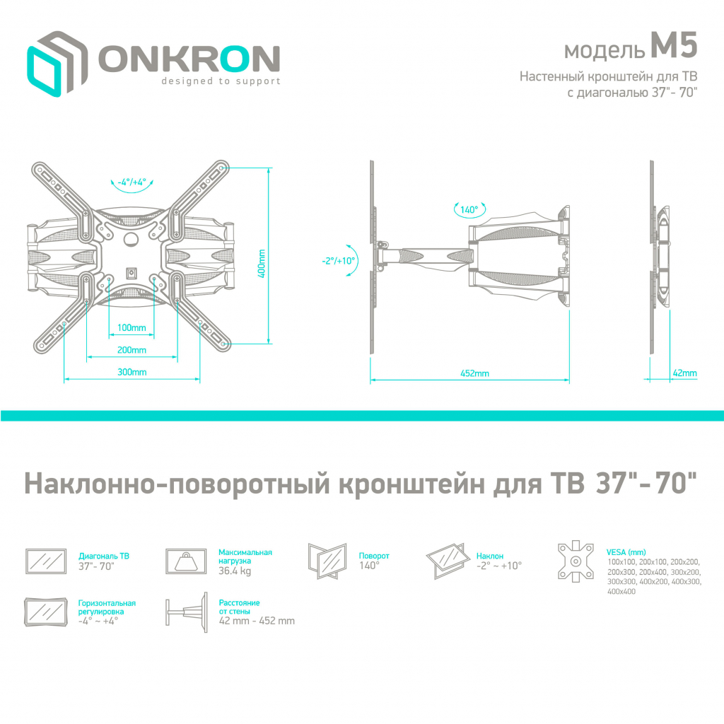 Стандарт Vesa: 100x100, 200x100, 200x300, 300x200, 200x200, 300x400, 100x200, 300x300, 200x400, 400x200, 400x300, 400x400, 300x100 мм