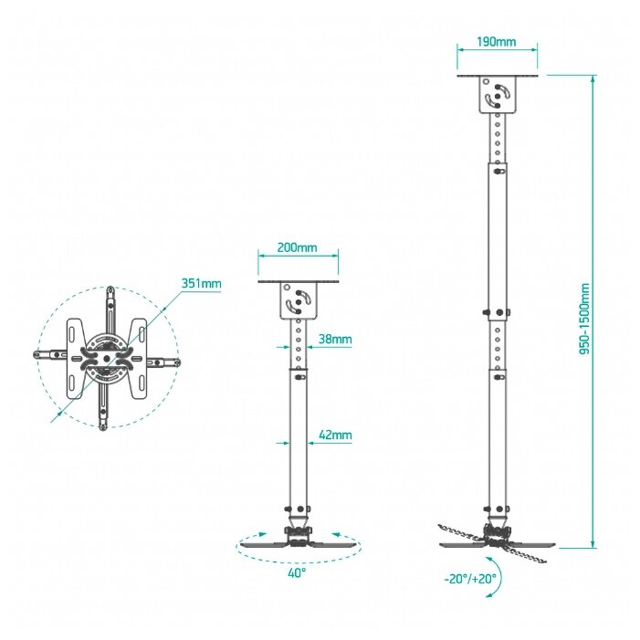 Дополнительная информация: ширина крепления к проектору: 100x100 - 273x273 мм; угол поворота: 40°; угол наклона: -20° ~ +20°; вылет от потолка: 950~1500 мм; материал: холоднокатаная сталь, SPCC class