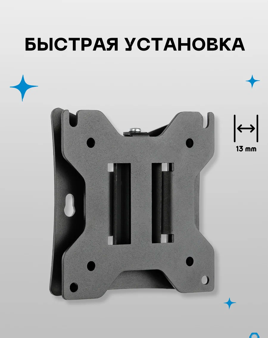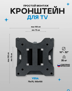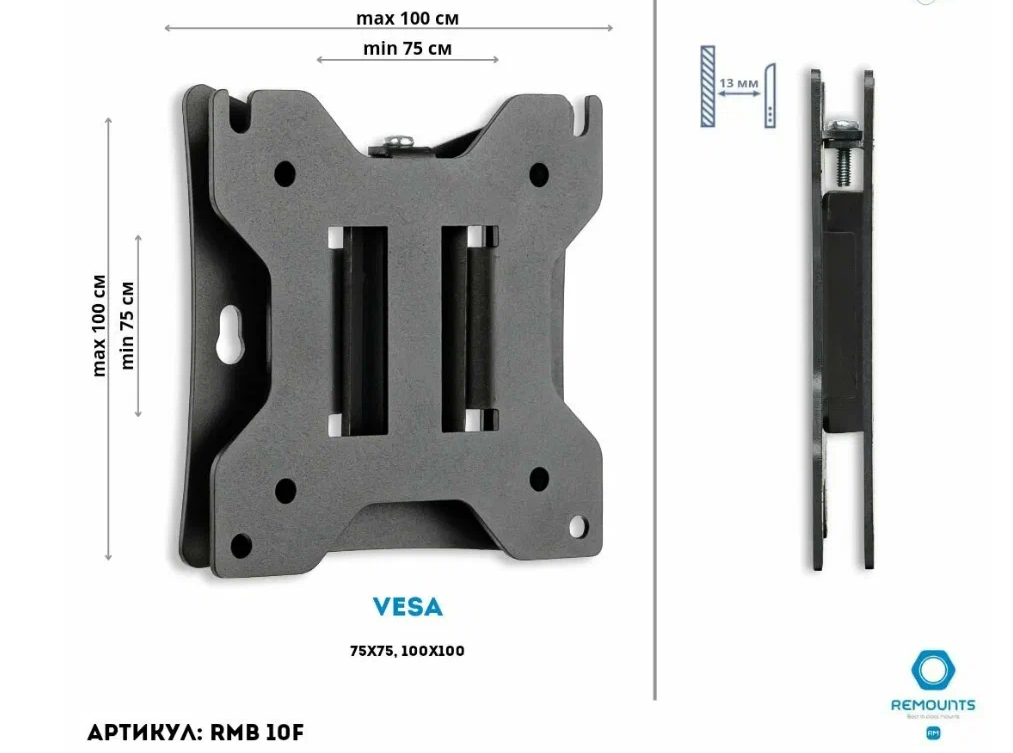 Кронштейн фиксированный Remounts RMB 10F для ТВ идеально подходит для большинства телевизоров с диагональю от 10" до 32" дюймов. Также подходит для экранов весом до 35 кг. Стандарт VESA 75x75 и 100x100 мм. Безопасность проверена с нагрузкой 130 кг. Толщина металла 2 мм. Совместим с экранами больших размеров, если их характеристики соответствуют креплению.