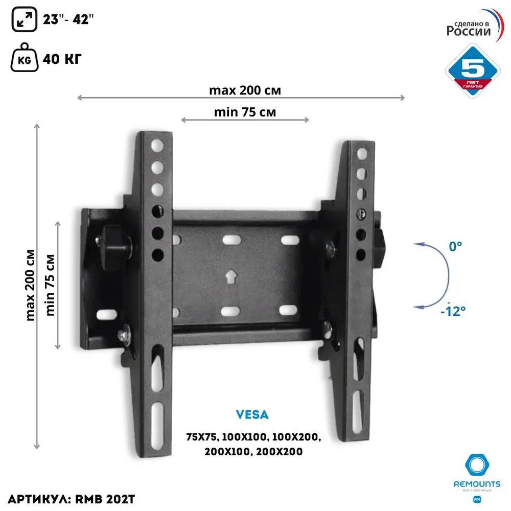 Характеристики: Кронштейн для телевизора настенный наклонный Remounts RMB 202T черный 23"-42" дюйма