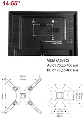 Кронштейн наклонно-поворотный YT-X400 предназначен для телевизоров с диагональю от 14 до 55 дюймов.