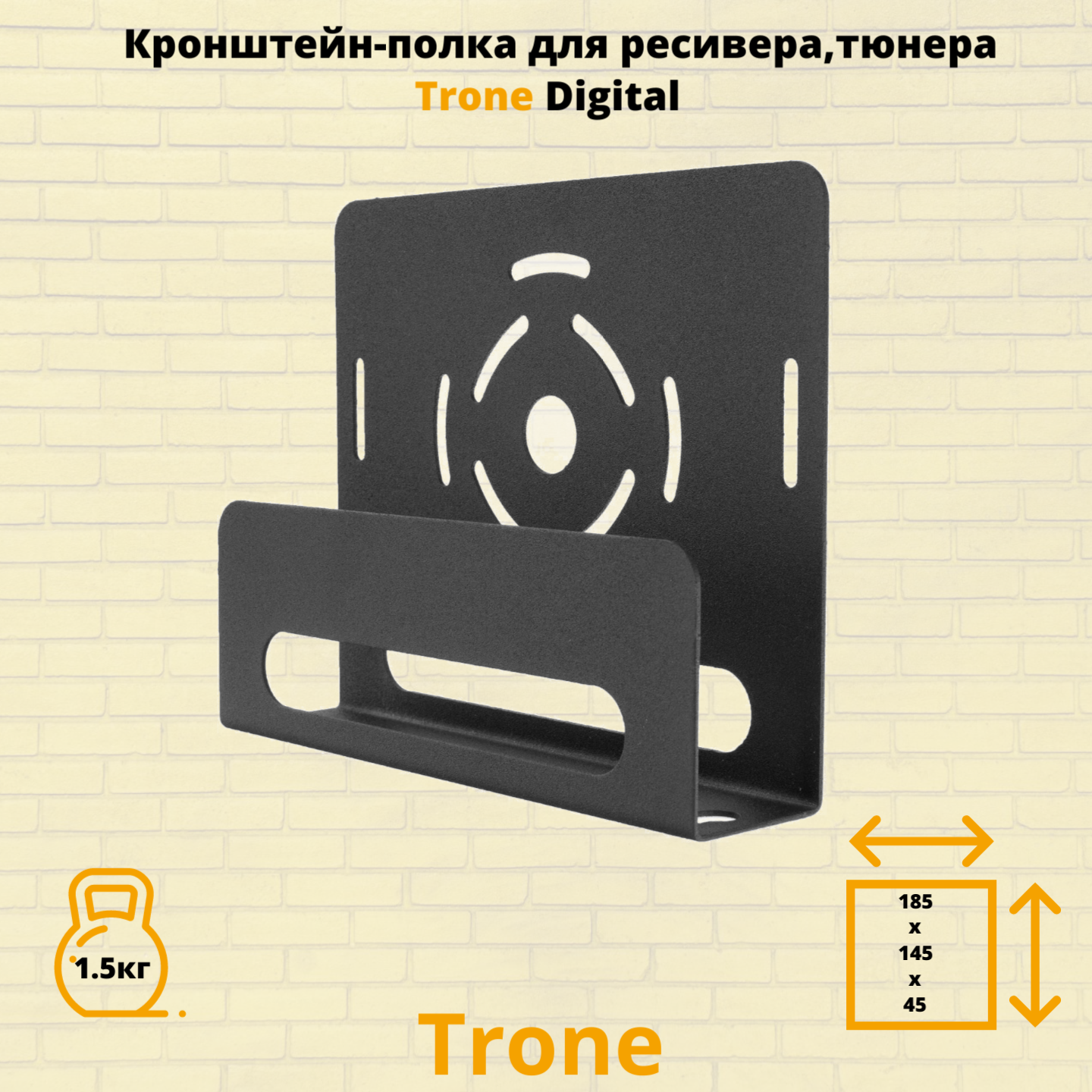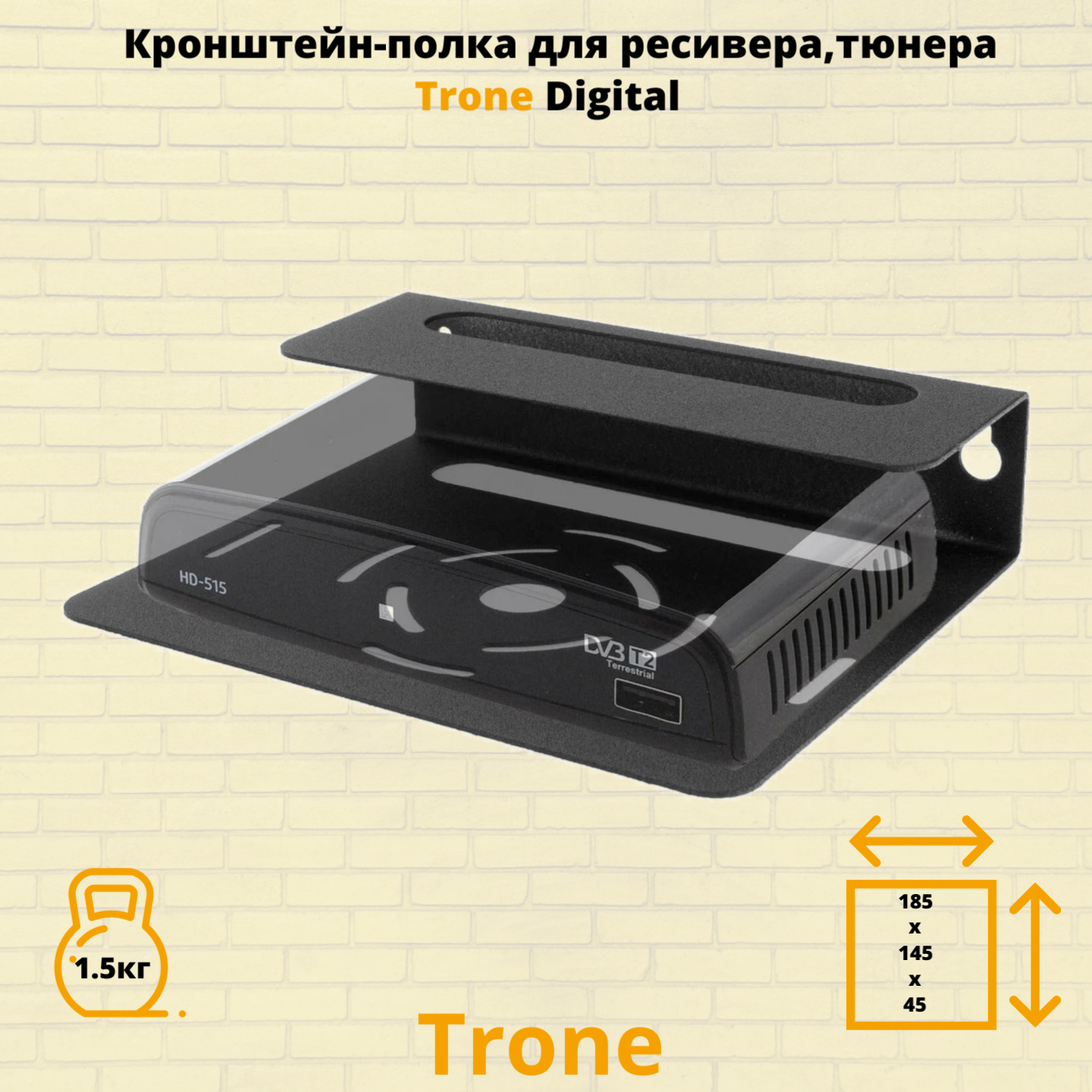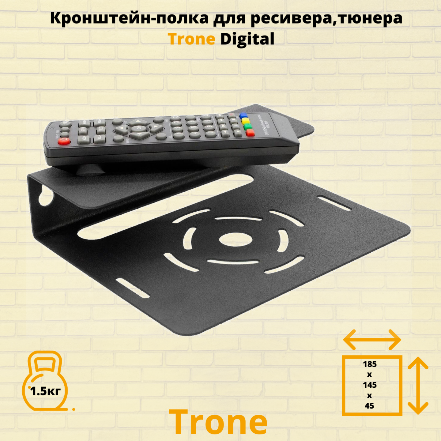 Модель Trone Digital разработана для крепления ресиверов, тюнеров, в особенности учитывает параметры ресивера, так полюбившегося сегодня Триколор ТВ. Универсальная конструкция подходит для большинства DVBT устройств, а так же : blu-ray или DVD плеера , спутникового ресивера небольшого размера. Универсальное применение полки в быту позволяет использовать ее в коридоре, на кухне, в подсобных помещениях, гараже. Кронштейн Trone Digital выдерживает нагрузку до 1.5 килограмма. Расстояние от стены 145 мм. , ширина 185 мм. , высота 45 мм. В верхней и нижней частях полки сделаны отверстия для охлаждения приставки.