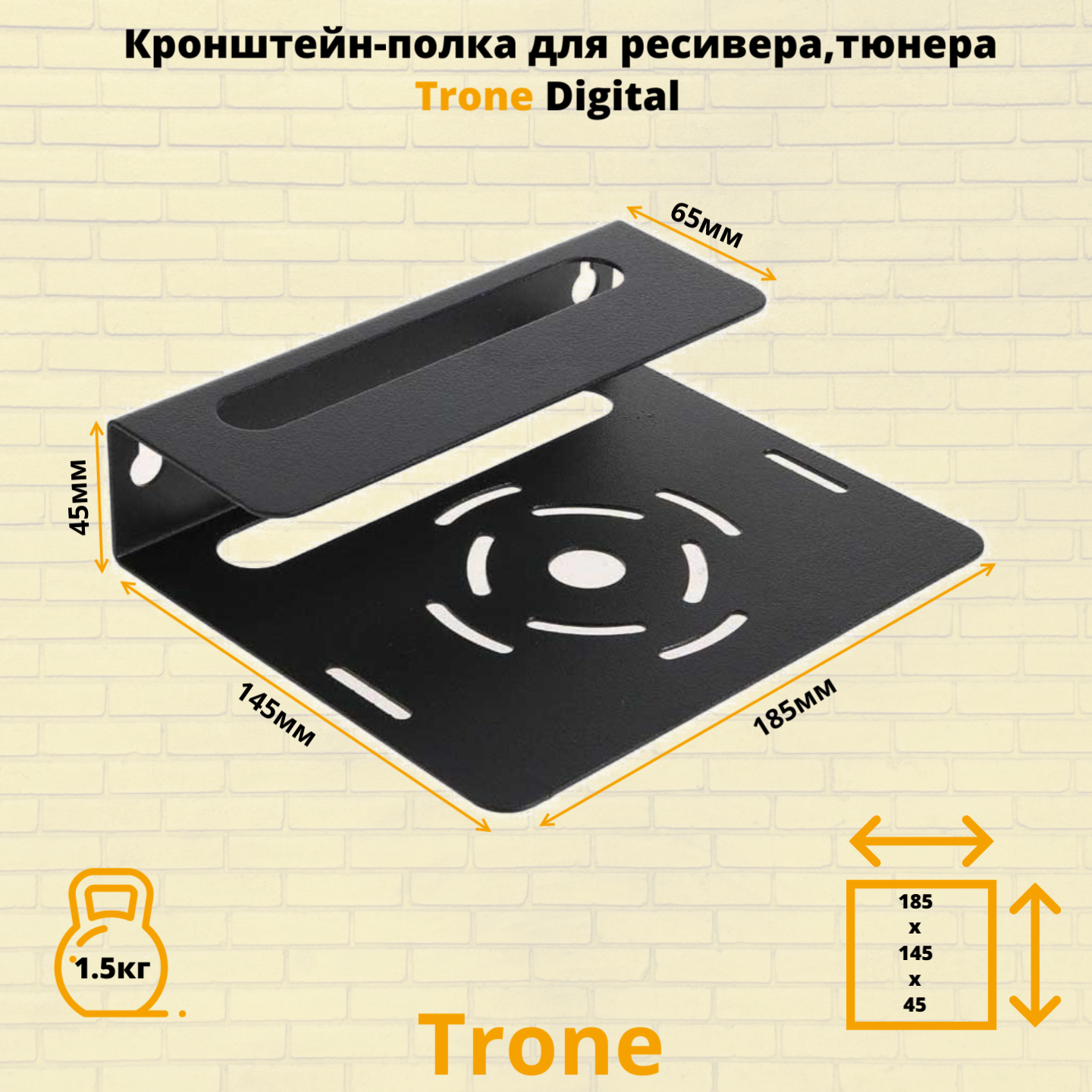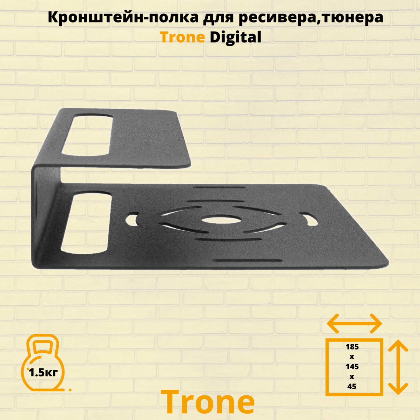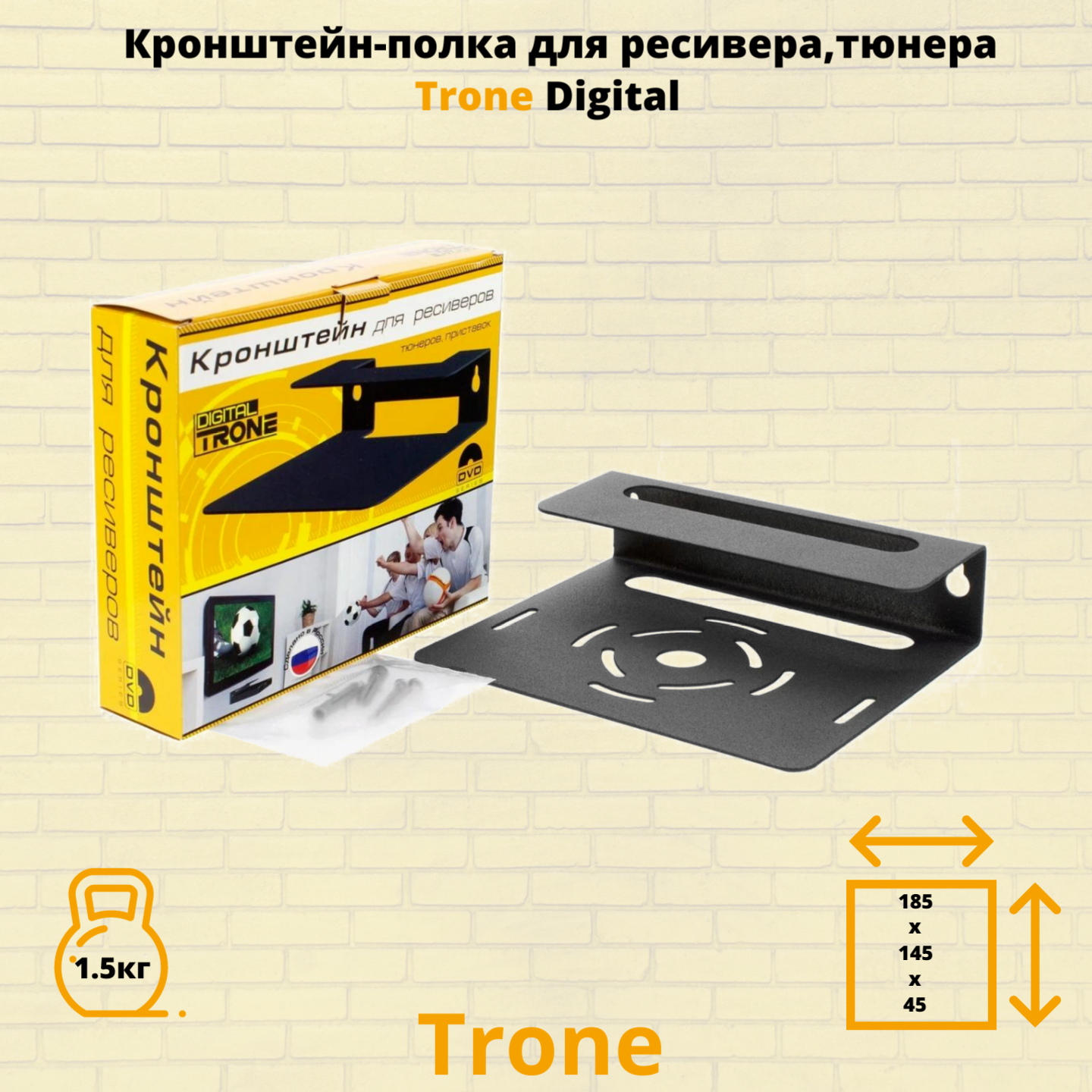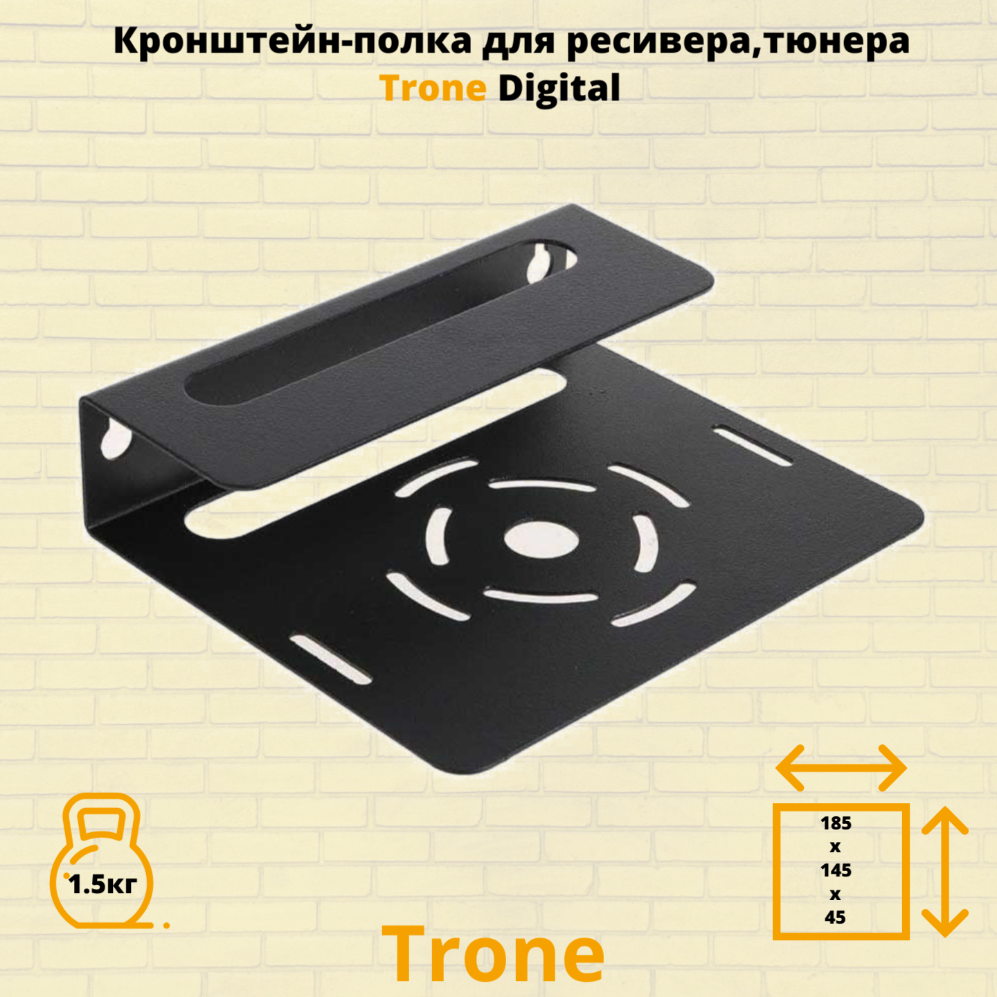 Модель Trone Digital разработана для крепления ресиверов, тюнеров, в особенности учитывает параметры ресивера, так полюбившегося сегодня Триколор ТВ. Универсальная конструкция подходит для большинства DVBT устройств, а так же : blu-ray или DVD плеера , спутникового ресивера небольшого размера. Универсальное применение полки в быту позволяет использовать ее в коридоре, на кухне, в подсобных помещениях, гараже. Кронштейн Trone Digital выдерживает нагрузку до 1.5 килограмма. Расстояние от стены 145 мм. , ширина 185 мм. , высота 45 мм. В верхней и нижней частях полки сделаны отверстия для охлаждения приставки.