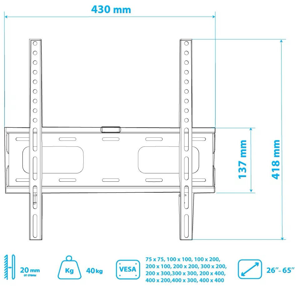Стандарт Vesa: 100x100 мм, 200x100 мм, 200x200 мм