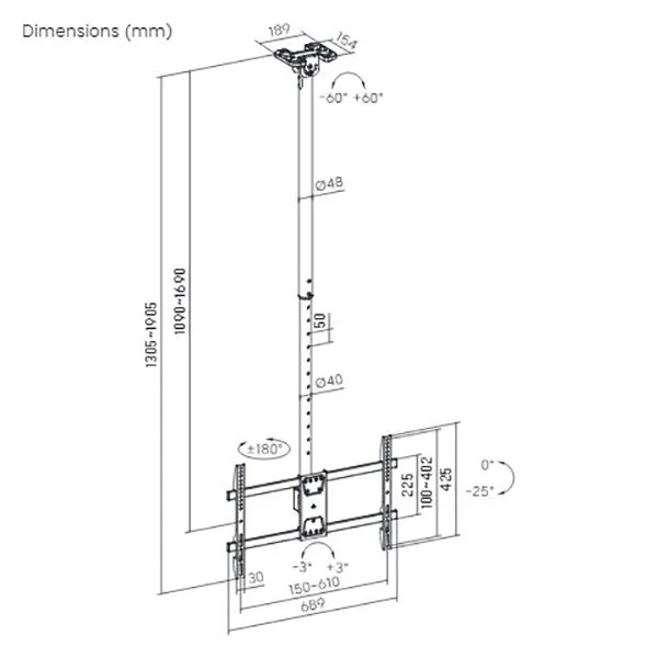 Телескопический потолочный наклонно-поворотный кронштейн для телевизоров и мониторов с диагональю от 43 до 86 дюймов.