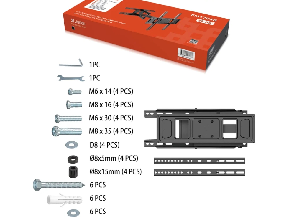 Настенный наклонно-поворотный кронштейн UNITEKI FM1704B в черном цвете предназначен для дисплеев и панелей с диагональю от 32 до 55 дюймов (81 - 139 см.).