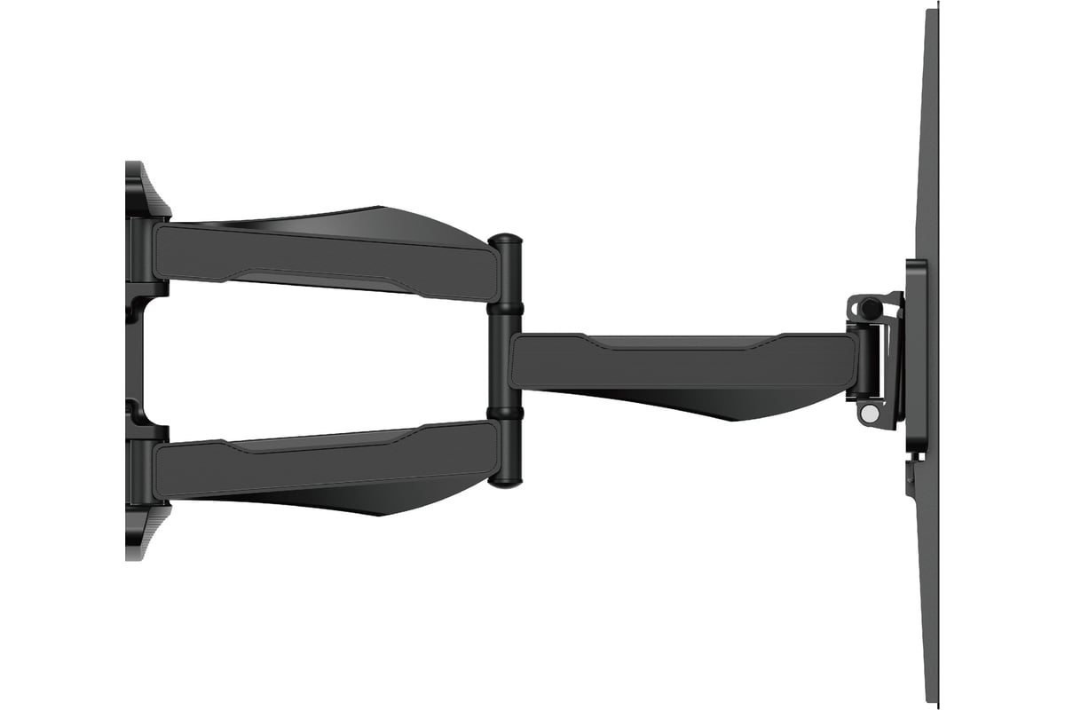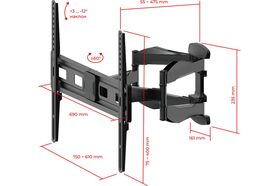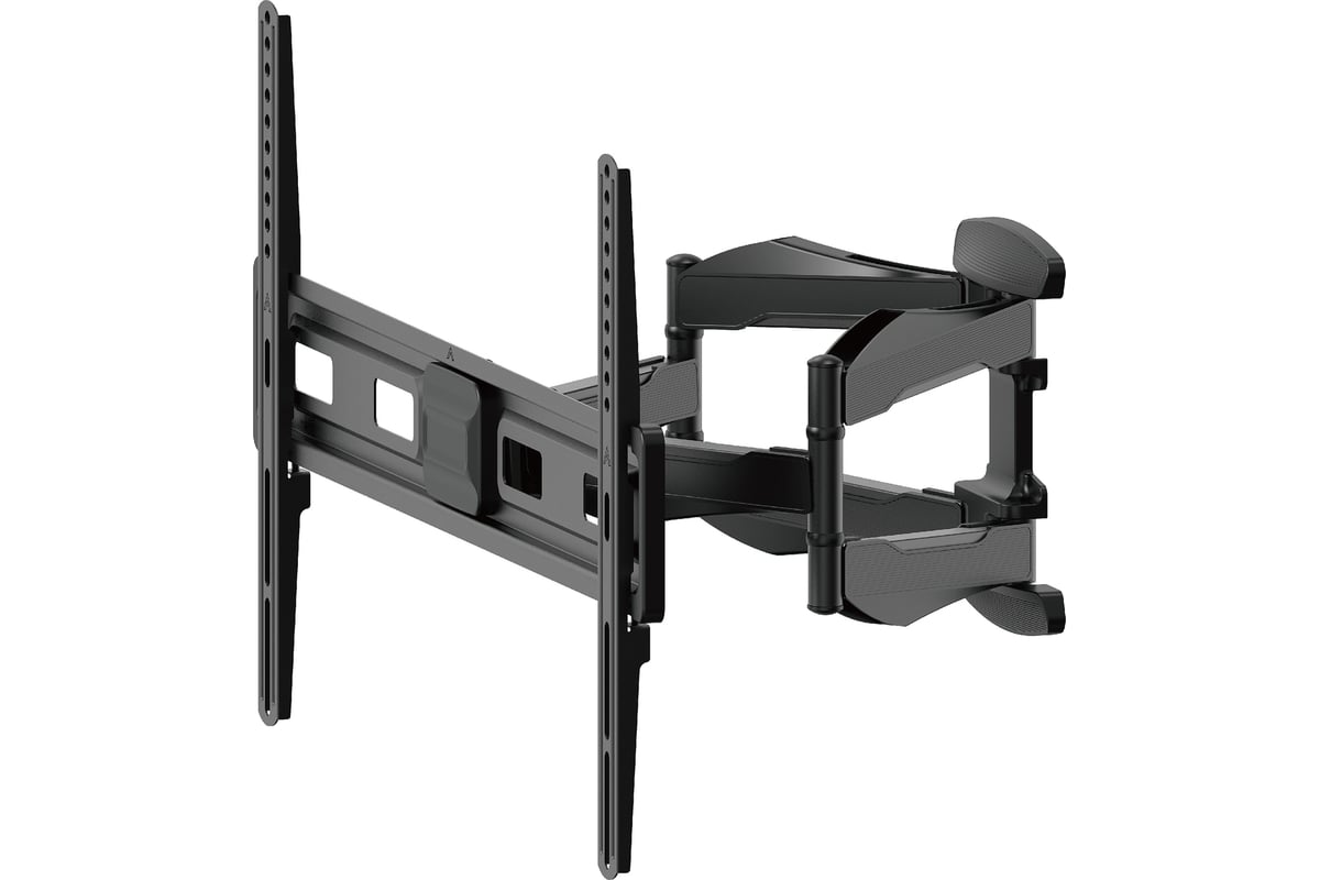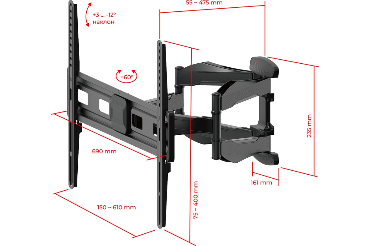 Кронштейн является одним из самых маневренных в своей категории. Он обладает широчайшими возможностями наклона и поворота, предусматривает регулировку экрана по вертикали и горизонтали. Крепкий и прочный, при этом элегантный кронштейн черного цвета станет прекрасным дополнением домашнего интерьера. Встроенный в корпус кабель-канал позволит спрятать и зафиксировать провода для удобства и эстетичного внешнего вида, а пластиковые декоративные накладки скроют всевозможные монтажные крепления.