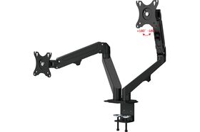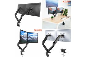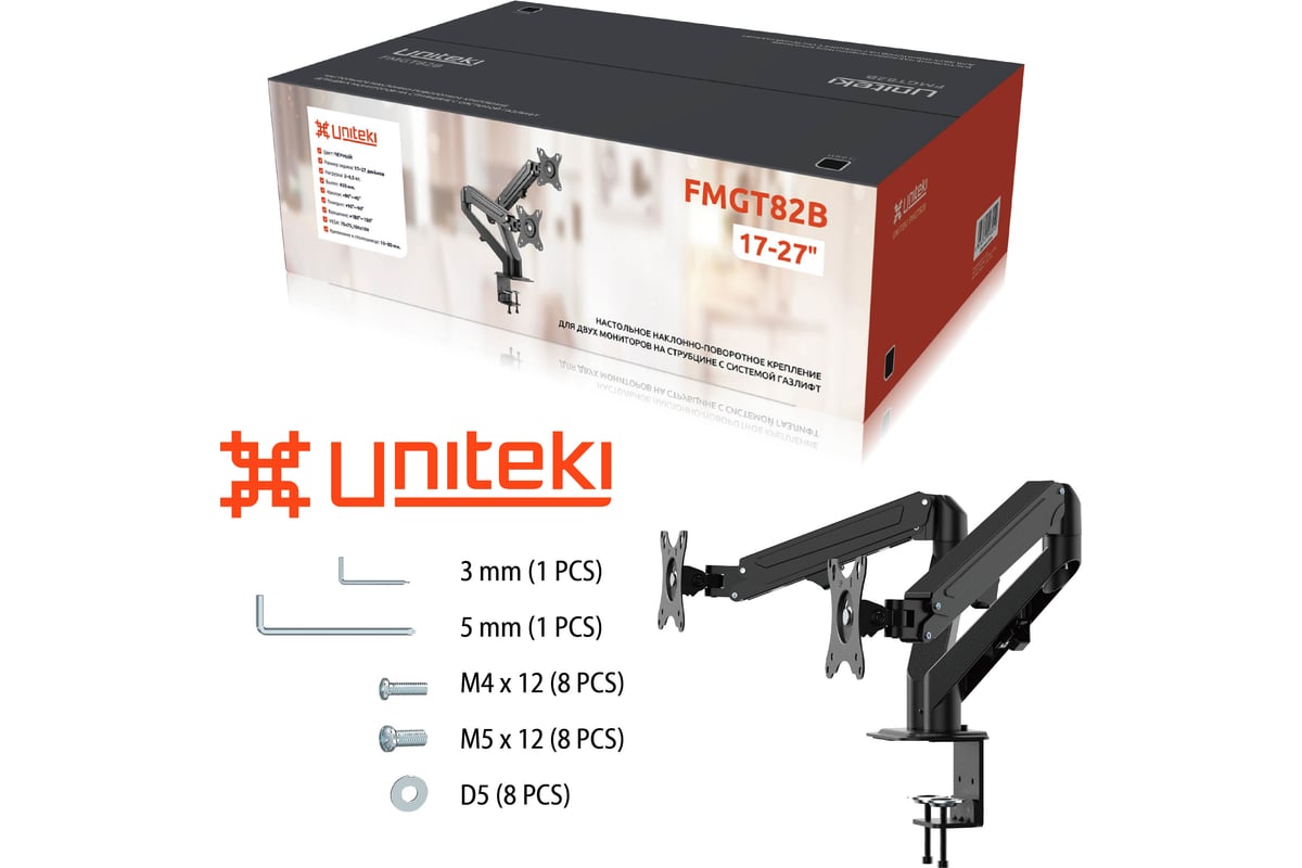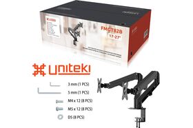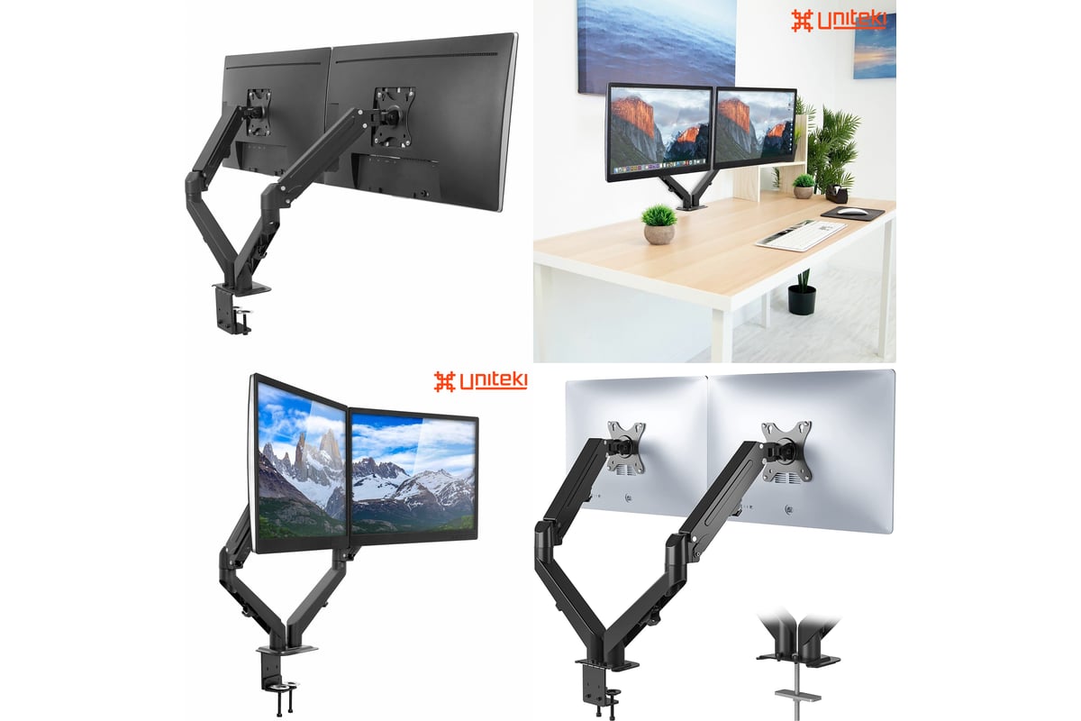 Настольный наклонно-поворотный кронштейн-крепление для двух мониторов с расположением в горизонтальной плоскости, системы газлифт, UNITEKI FMGT82B подходит для мониторов и телевизоров диагональю от 17 до 27 дюймов и весом от 2 до 6,5 кг на каждый.