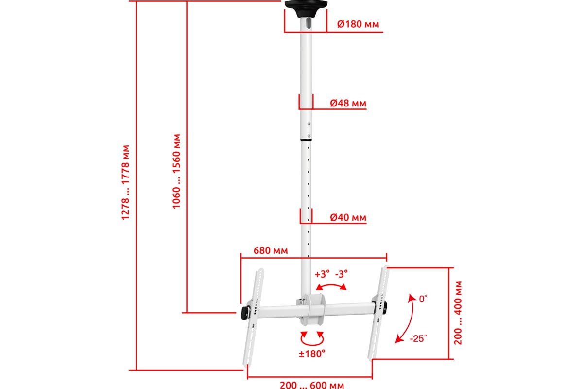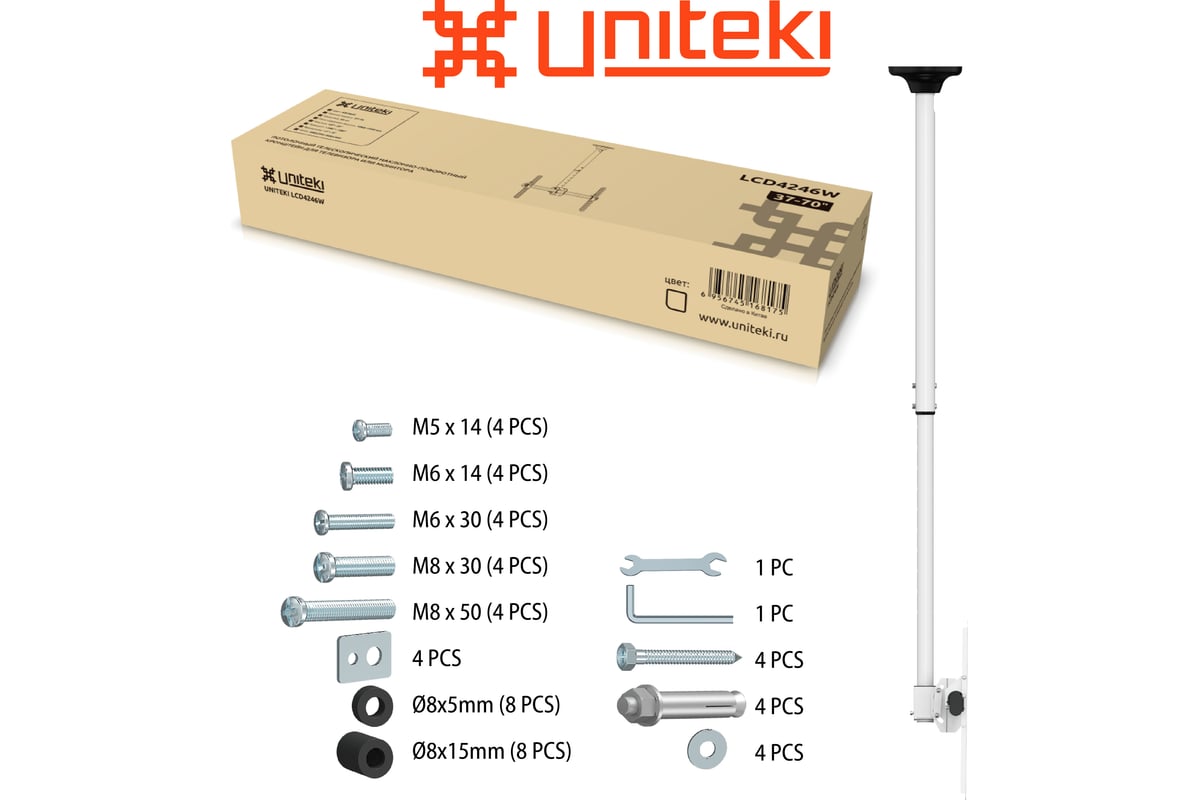 Потолочный наклонно поворотный кронштейн для телевизора или монитора UNITEKI LCD4246W в белом эксклюзивном окрасе. Кронштейн является одним из самых маневренных в своей категории. Он обладает широчайшими возможностями наклона, поворота и передвижением в вертикальной плоскости.
