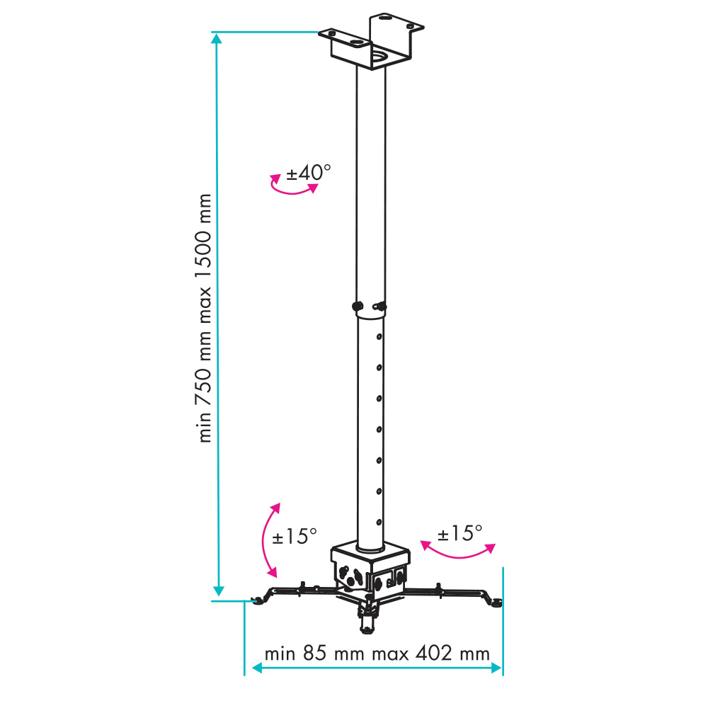 Дополнительная информация: расстояние от потолка 860-1480 мм; угол наклона ±15°; угол поворота ±15°
