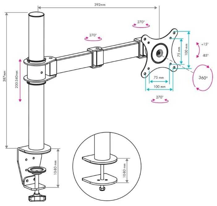 Дополнительная информация: два варианта крепления к столу, регулировка по высоте, угол наклона(°): +15 -85, угол поворота(°): 270, вращение экрана(°): 360, высота штанги 387 мм