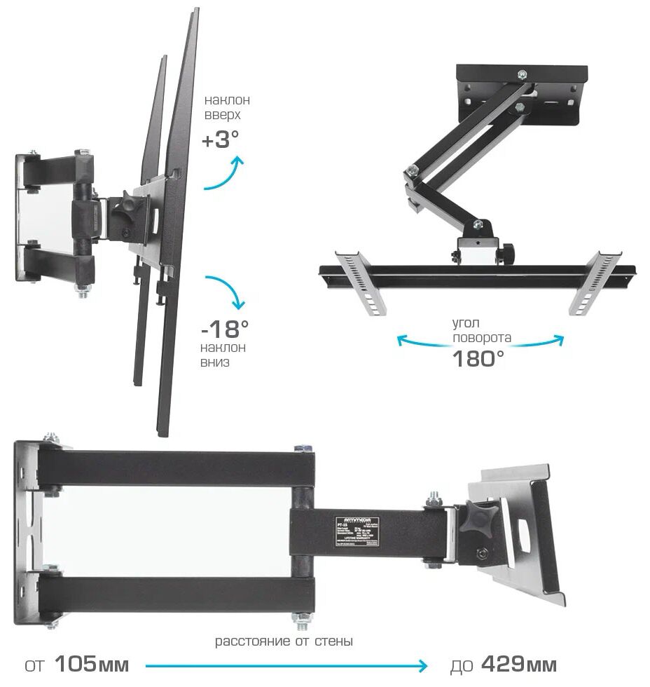 Дополнительная информация: расстояние от стены 105-429 мм, угол наклона -18°+5°, угол поворота 180°, встроенный кабель-канал