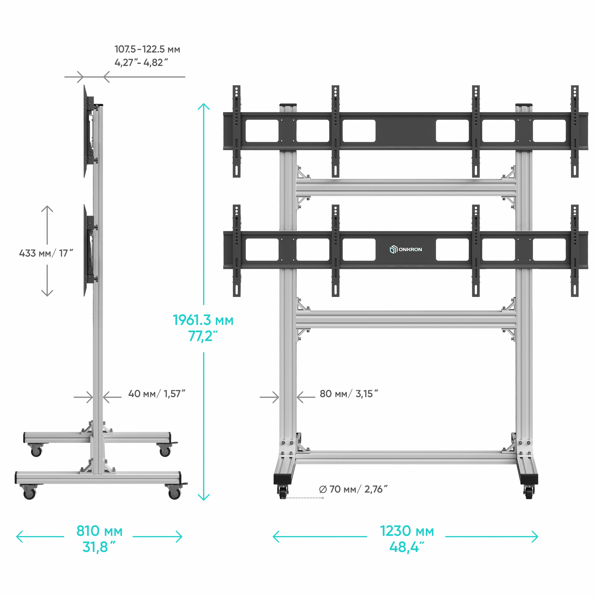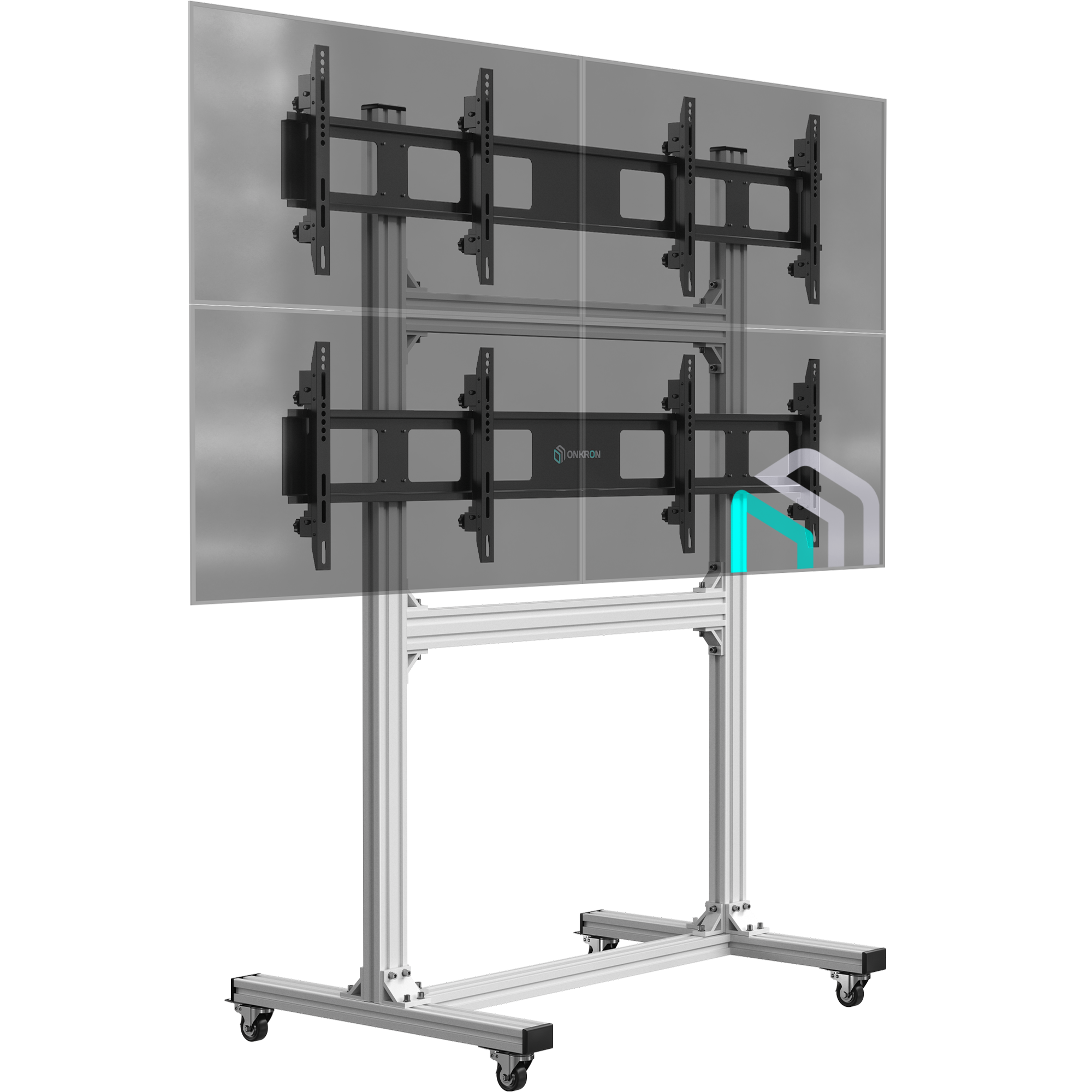Напольный мобильный стенд для видеостен ONKRON FSPRO2L-22 предназначен для размещения четырех digital-панелей диагональю от 40 до 55 дюймов. Максимальный выдерживаемый вес каждого из четырех экранов составляет 50 кг.