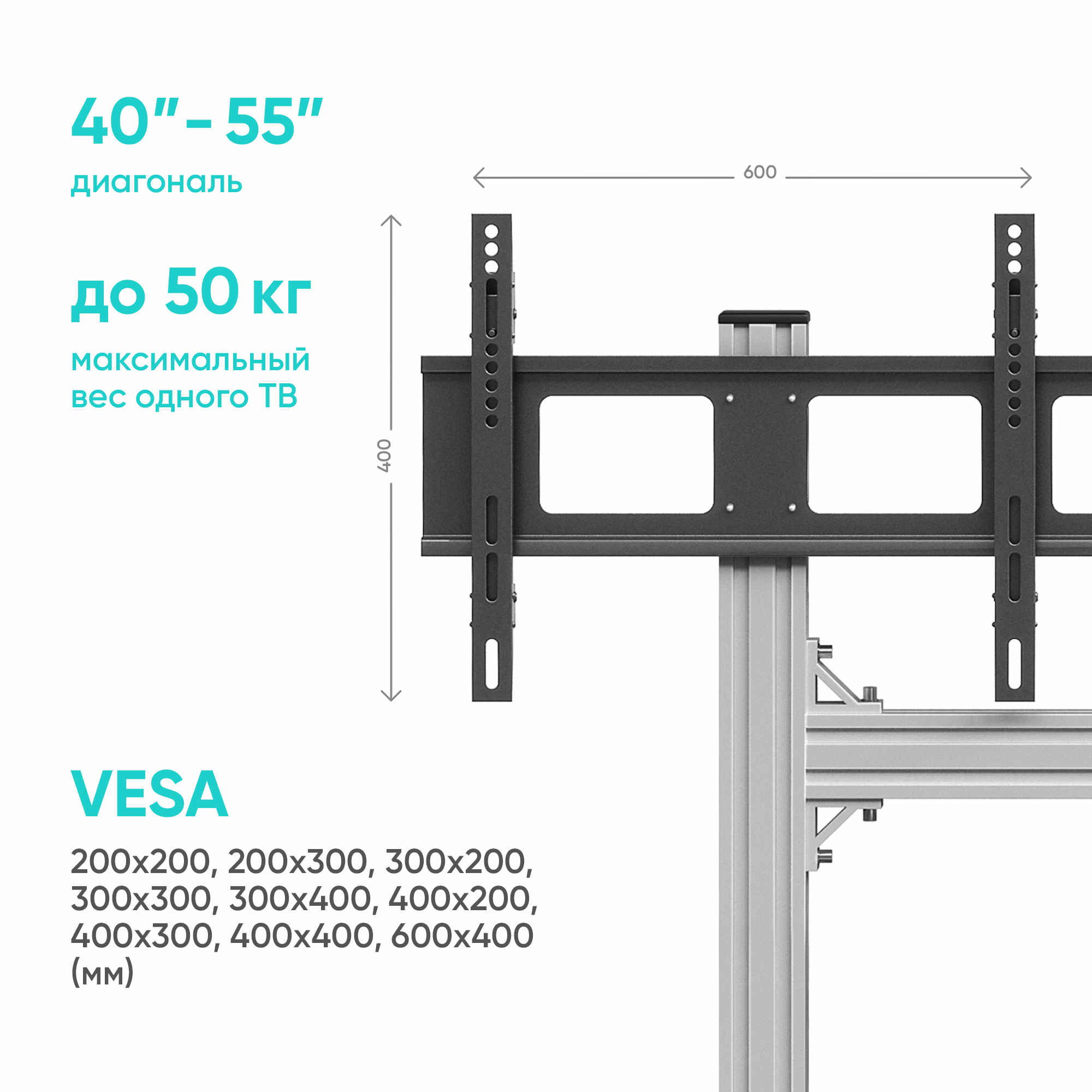 Производитель предусмотрел совершенно различные варианты крепления VESA: 200x200, 200x300, 300x200, 300x300, 300x400, 400x200, 400x300, 400х400, 600х400 мм. Широкий диапазон размеров делает максимально удобным подбор размещаемой панели.