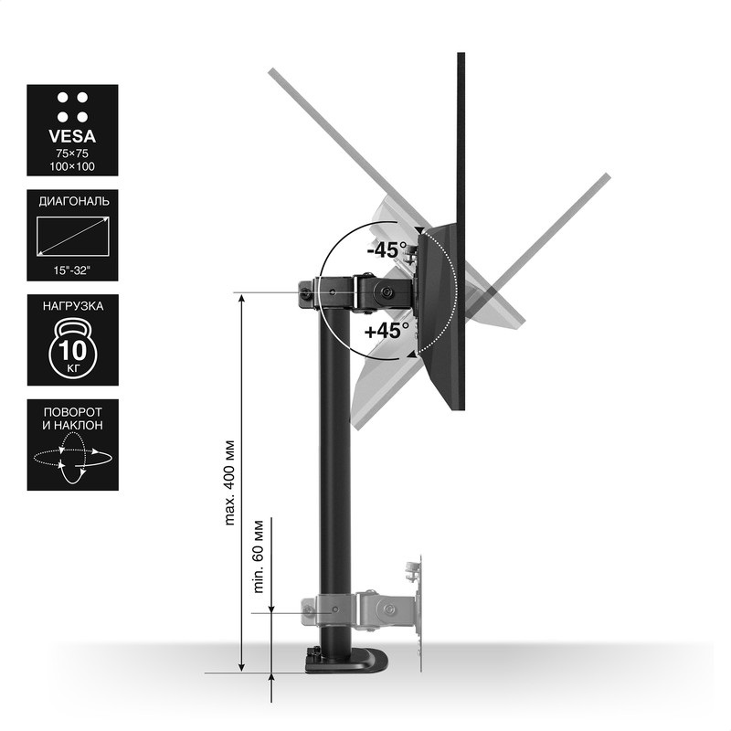 Регулируемая высота: Позволяет настроить высоту монитора в зависимости от роста пользователя и его предпочтений, что способствует более удобной работе и снижает нагрузку на шею и спину.