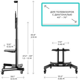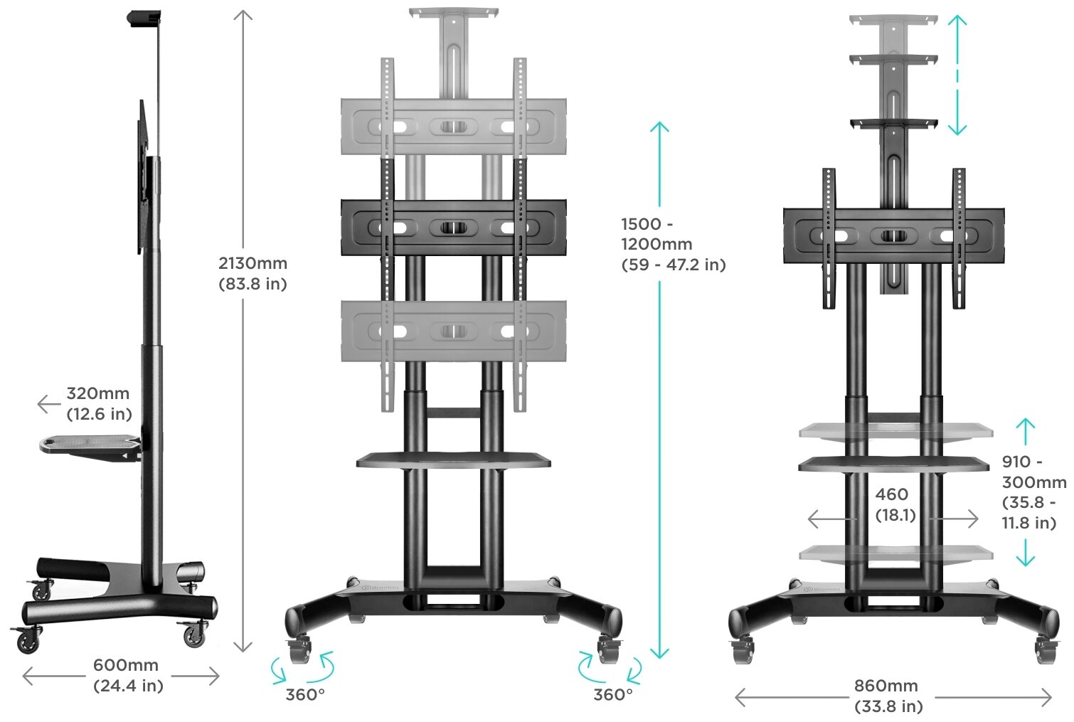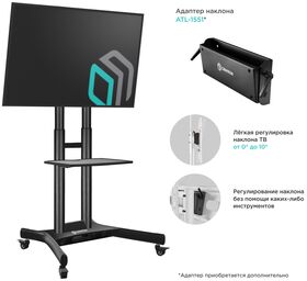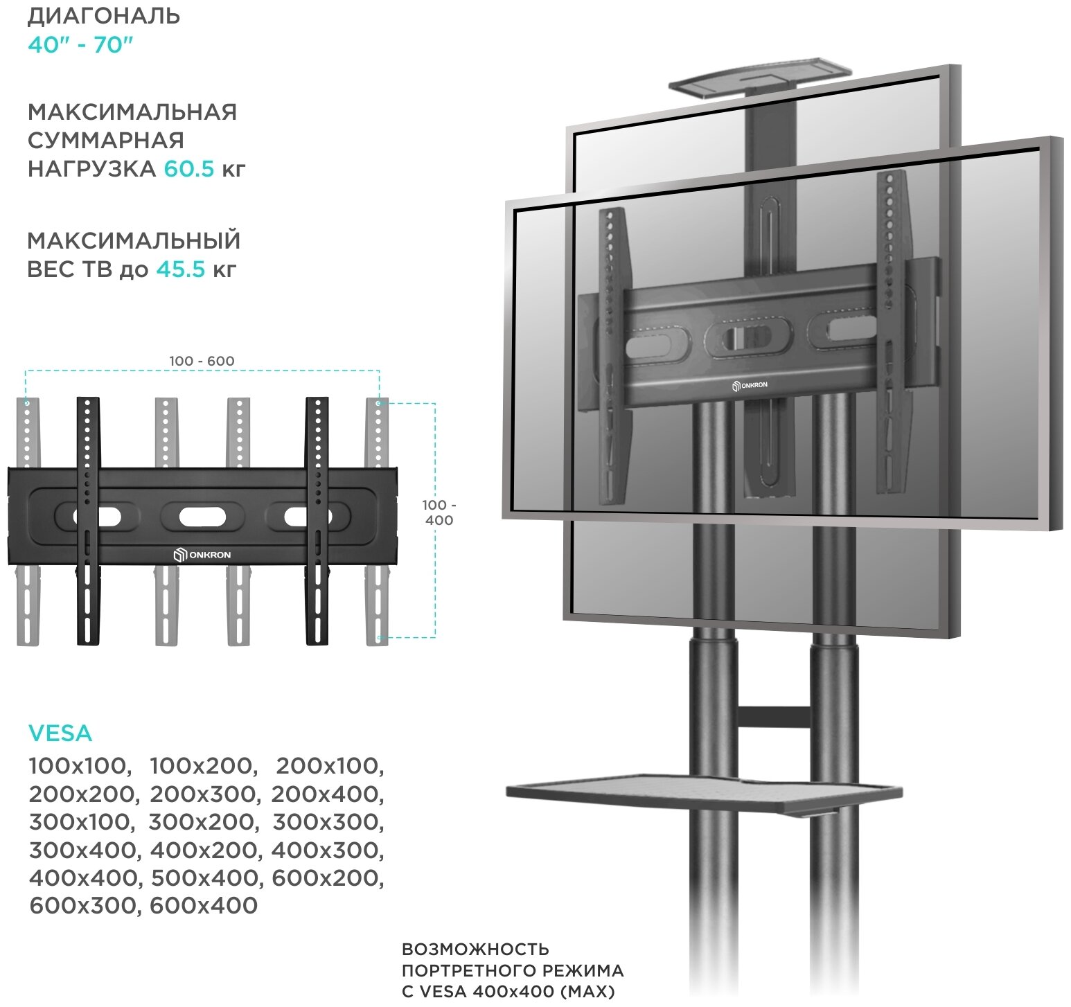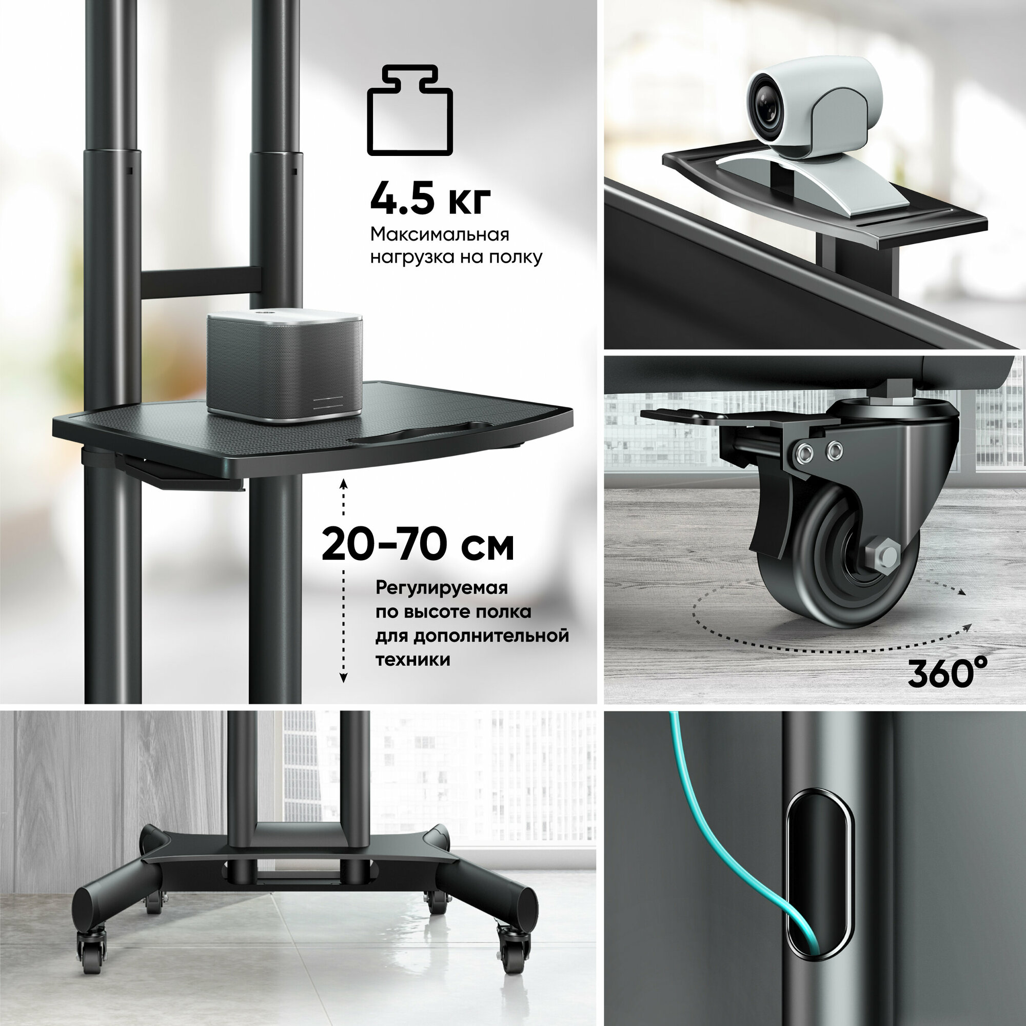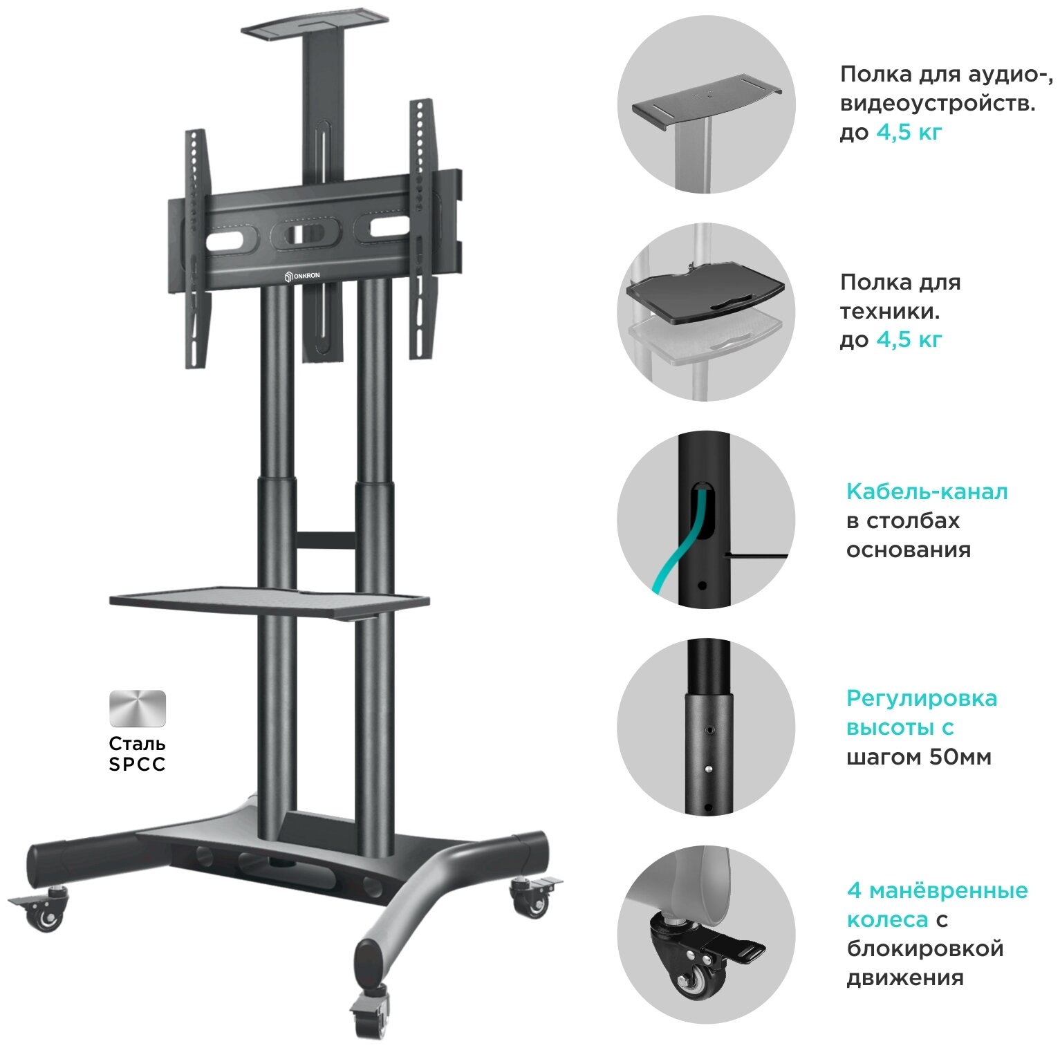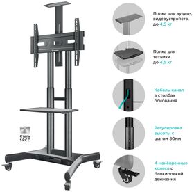 Различные варианты крепления VESA. Простая и быстрая настройка высоты. Полки для дополнительной техники. Встроенный кабель-канал.Надёжные колеса с системой фиксации. Дополнительная опция