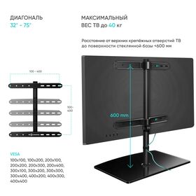 Крепежные отверстия (VESA), мм: 100x100, 100x200, 200x100, 200x200, 200x300, 200x400, 300x100, 300x200, 300x300, 300x400, 400x200, 400x300, 400x400