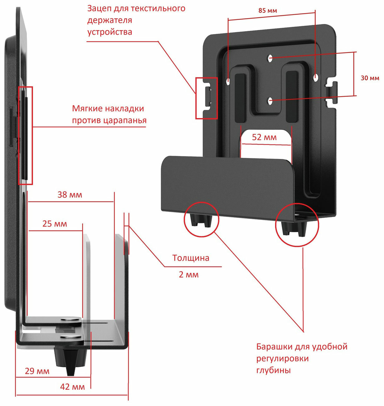 Система регулировки глубины с удобными барашками для фиксации и страховочный ремешок, позволят плотно зафиксировать Ваше устройство, даже при наличии вибрации.