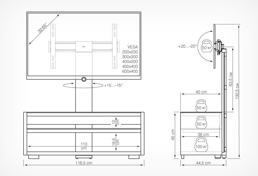 угол наклона -20°+20°, угол поворота ±15°, функция коррекции после установки ±4°, встроенный кабель-канал
