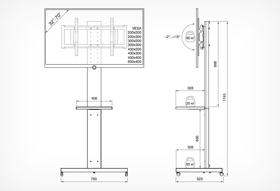 Мобильная стойка для ТВ и аудио- видеоаппаратуры, которая идеально подойдет как для домашнего использования, так и для офисов, торговых центров и спортивных сооружений. Кронштейн на стойке регулируется в 7 положениях по высоте с шагом в 5 см для удобного расположения ТВ.