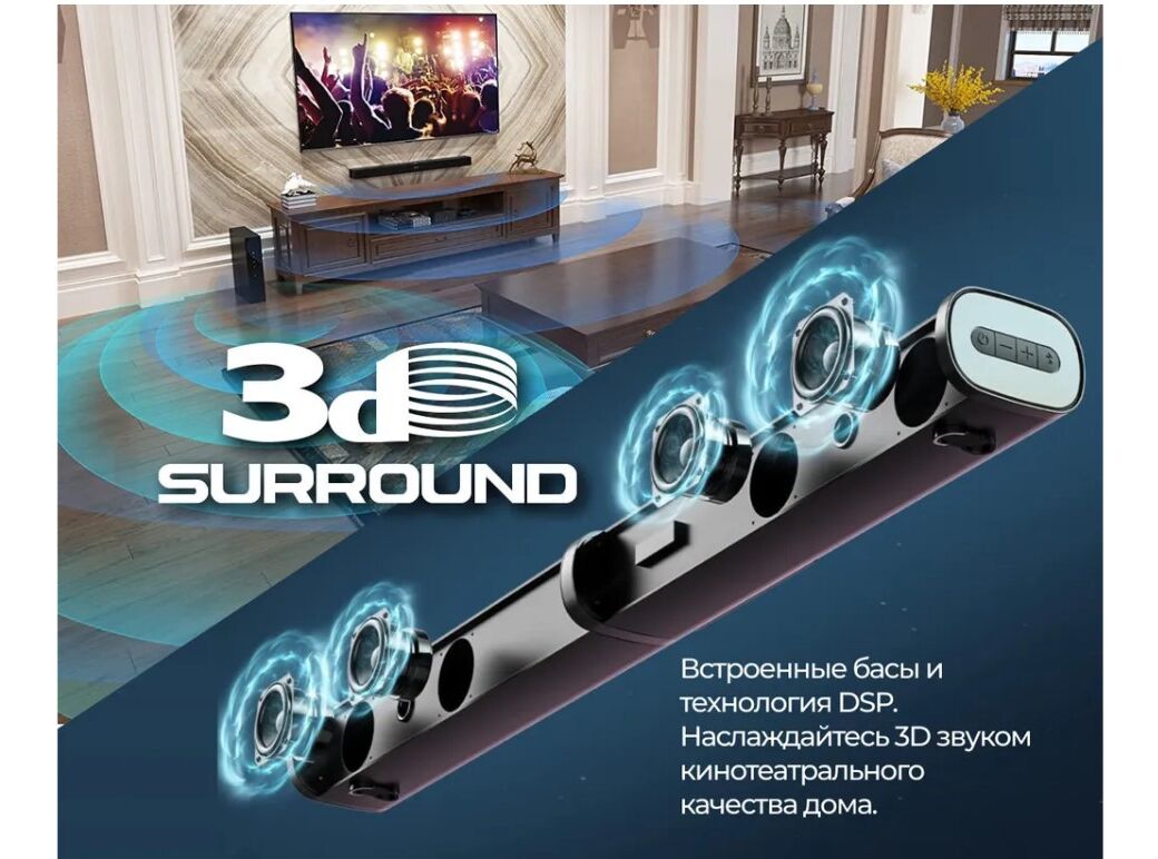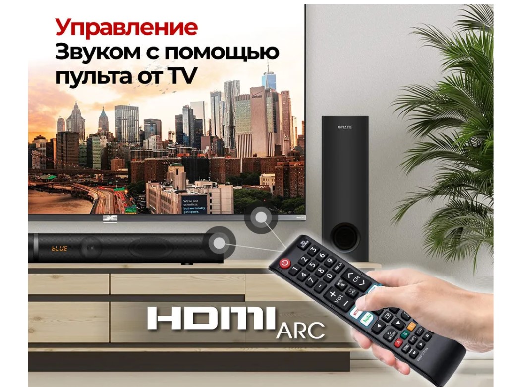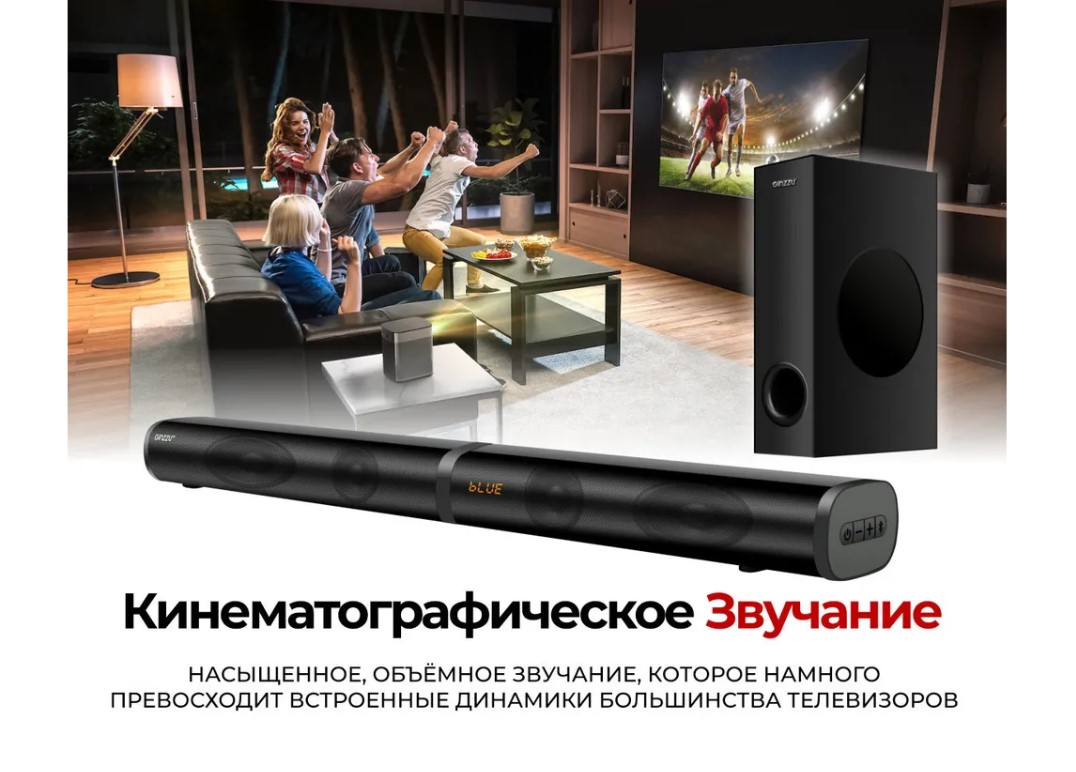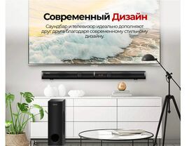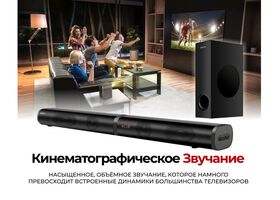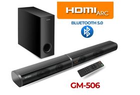 Саундбар Ginzzu GM-506 это акустическая система нового поколения c объемным звучанием 3D SURROUND, с проводным сабвуфером, с Bluetooth V5.0, с великолепным звуком и стильным дизайном. Она способна передавать детальный, объемный и кристально чистый звук. Это идеальная многофункциональная музыкальная система как для телевизора, так и для дома. Пульт с возможностью управлять громкостью телевизора с помощью HDMI(ARC), оптический вход, вход DC-jack 3,5мм, USB-flash. Акустическая система 2.1 , выходная мощность 100Вт - (2х25Вт + 50Вт), 75Гц- 15кГц, HDMI(ARC) вход, OPTICAL вход, LINE IN вход DC-jack 3,5mm, аудиоплеер USB-flash, пульт ДУ, питание от сети 220В-240В / 50Гц - адаптер питания GA-3047, регулировка громкости, низких частот, эквалайзер, режимы MUTE, STANDBY, крепежный комплект, размеры: саундбар - 815 х 100 х 70 мм, сабвуфер - 120 х 220 х 405 мм