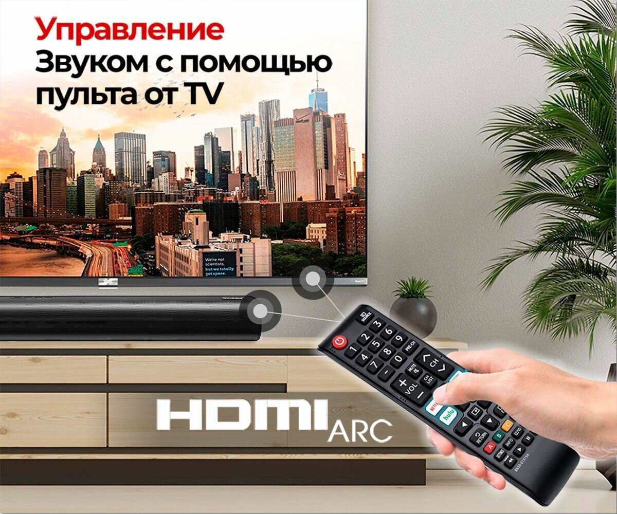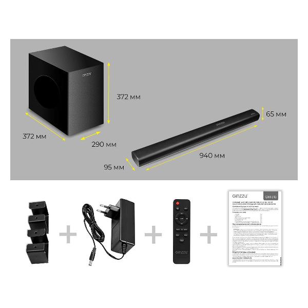 Модель функционирует в широком диапазоне частот от 50 до 15000 Гц. Саундбар Ginzzu GM-515 поставляется вместе с сабвуфером, который характеризуется глубоким и насыщенным басом. На корпусе устройства расположены HDMI-интерфейс, USB-разъем и аудиовыход диаметром 3,5 мм. С помощью специального кронштейна из комплекта акустическую систему можно зафиксировать на стене. Модель произведена из высокопрочных материалов, что обеспечивает устойчивость к механическим повреждениям, изнашиванию и нагрузкам. Саундбар надолго сохраняет потребительские качества.