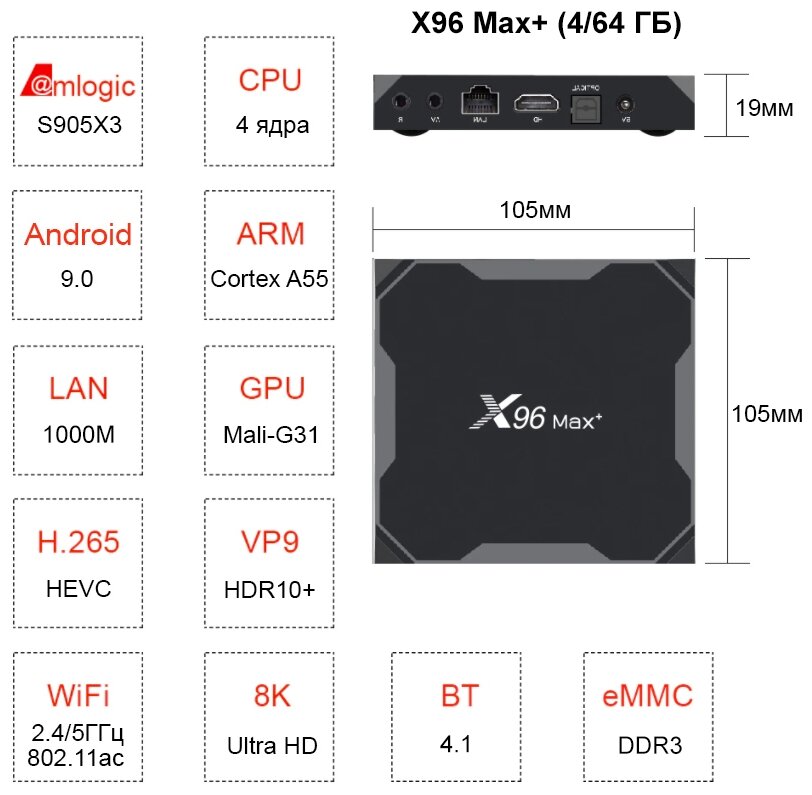 1 * X96 MAX Plus. 4 Гб / 64 Гб. Смарт ТВ приставка. Android 9.0 медиаплеер. Amlogic S905X3;