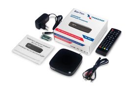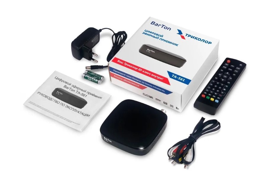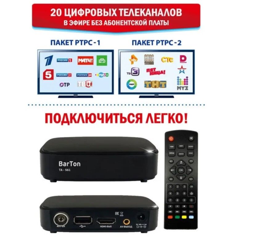 Цифровая приставка для цифрового тв BarTon TA-561 со встроенным тюнером DVB-T2 предназначен для приёма открытых каналов эфирного вещания высокой четкости. Дальность и качество приёма зависит от места установки приёмной антенны, мощности передатчика, рельефа местности, времени года, уровня помех и других факторов. Цифровой приемник BarTon TA-561 способен принимать до 30 эфирных каналов в Москве и до 20 каналов в других регионах. Бесплатные каналы доступны при наличии комнатной или уличной антенны, а так же зависит от рельефа местности. Данная приставка для телевизора имеет подарок от Триколор: возможность в течении 31 дня бесплатно просматривать более 10 000 фильмов и сериалов и 200 каналов в приложении "Триколор Кино и ТВ". Для этого найдите на корпусе цифрового приёмника или на наклейке внутри коробки специальный Триколор ID и введите его при регистрации в приложении "Триколор Кино и ТВ", доступном на смартфонах, планшетах и Smart TV: всего можно подключить до 5 разных устройств.