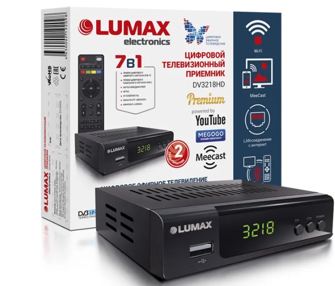 Новейшая модель цифрового телевизионного приемника LUMAX DV3218HD для приема цифрового эфирного и кабельного телевидения в стандартах DVB-T2/С с возможностью выхода в интернет порадует всех, кто любит телевидение. Благодаря сверхчувствительному улучшенному процессору* вам станут доступны первоклассное изображение и объемное стереозвучание Dolby Digital («звук вокруг»). Приемник воспроизводит все основные форматы (AVI/MKV/MPG/TS/MP3/JPG/BMP/JPEG/PNG и т. д.), есть функции родительского контроля, музыки, фото и видео, записи онлайн с экрана, TimeShift (включение паузы с возможностью последующего просмотра) и многое другое. С помощью порта LAN можно легко подключить приемник к Интернету и смотреть IP-плейлисты m3u (до 1000), YouTube, передавать контент со смартфона на телевизор с помощью MeeCast, пользоваться Gmail, а также приложениями «Кинозал LUMAX» и «Онлайн-кинотеатр Megogo», насчитывающими в своих кинотеках более 2500 любимых художественных фильмов, сказок, сериалов и т.п. Защита от короткого замыкания станет выгодным отличием LUMAX DV3218HD от приемников других производителей. В комплект входит обучаемый пульт ДУ премиум-класса.