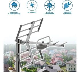 Антенна обеспечивает уверенный приём и усиление сигнала цифрового эфирного телевидения стандарта DVB-T2 (до 30 бесплатных федеральных каналов) на удалении до 40 км от ретранслятора. Отличается компактными размерами.
