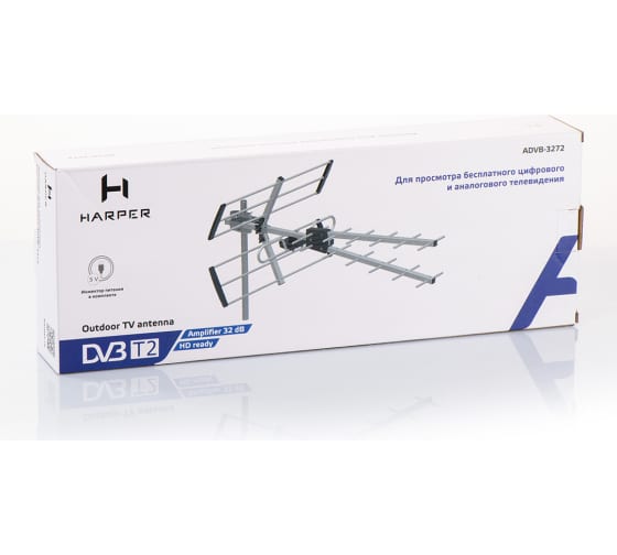 Активная внешняя антенна Harper ADVB-3272 может применяться в условиях пригородных районов на существенном удалении от источников сигнала - до 95 км при прямой видимости (при отсутствии преград или помех на пути до ретранслятора). Коэффициент усиления составляет 32 дБ при уровне шума менее 4 дБ. Таких показателей позволяет добиться особая пространственная конструкция с двухлучевой траверсой и малошумящий усилитель, питающийся напряжением 5 В.