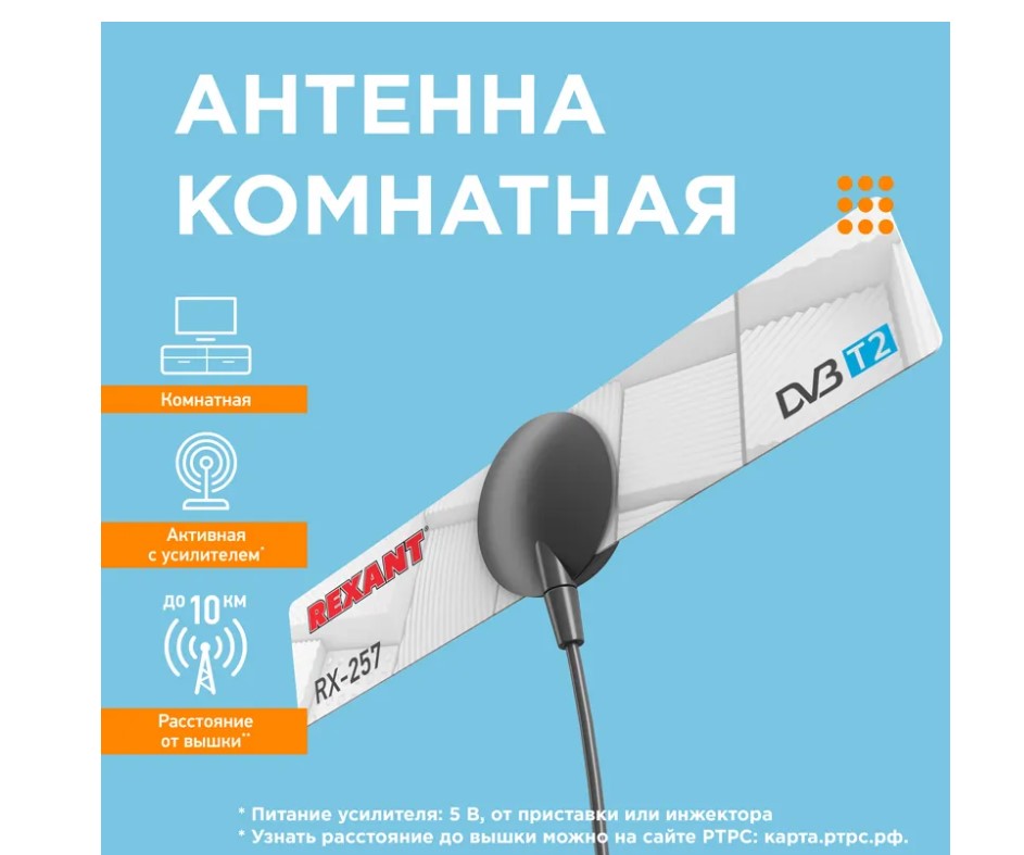 Антенна активная (со встроенным усилителем), комнатной установки, предназначена для приема цифрового эфирного ТВ вещания в стандарте DVB-T2.Использутся для приема цифрового эфирного вещания на современных телевизорах или комбинированных ресиверах, укомплектованных тюнером стандарта DVB-T2.Характеристики:- Установка антенны: комнатная;- Назначение: для приёма цифрового эфирного ТВ вещания;- Коэффициент усиления: 33 дБи;- Волновое сопротивление: 75 Ом;- Дальность установки от БС: до 10 км;- Кабель: 1,2 м;- Тип подключения: ТВ штекер;- Усилитель: да, встроенный;- Питание усилителя*: 5 В, от приставки или инжектора (арт. 34-0455);- Масса: 0,1 кг;- Размеры в сборе: 210х40х20 мм;- Тип упаковки: коробка с держателем, картон;- В комплект входит: антенна, крепление (присоски), руководство пользователяДополнительная информация: Посмотреть зону покрытия цифрового ТВ (DVB-T2), или определить удаленность Базовой Станции (телецентра) от вашего района или населенного пункта можно на официальном сайте РТРС: Без подачи питания антенна работать не будет.