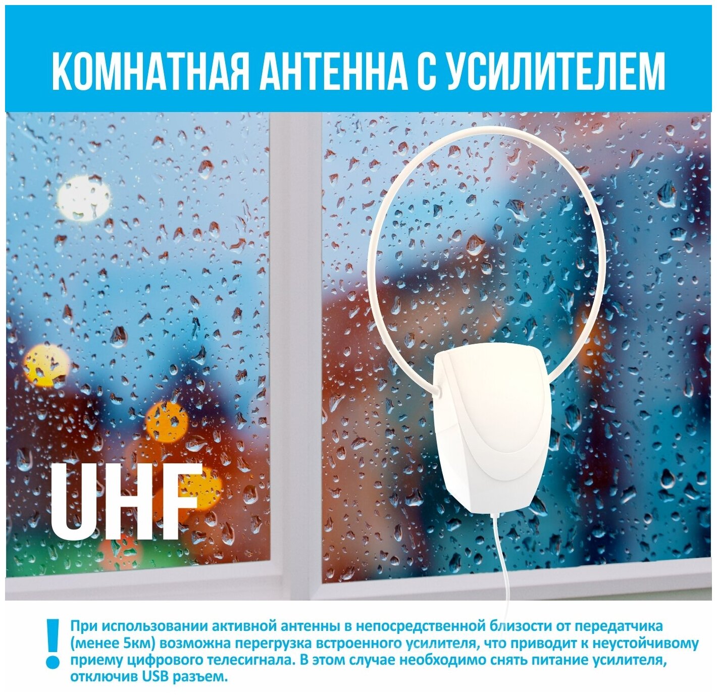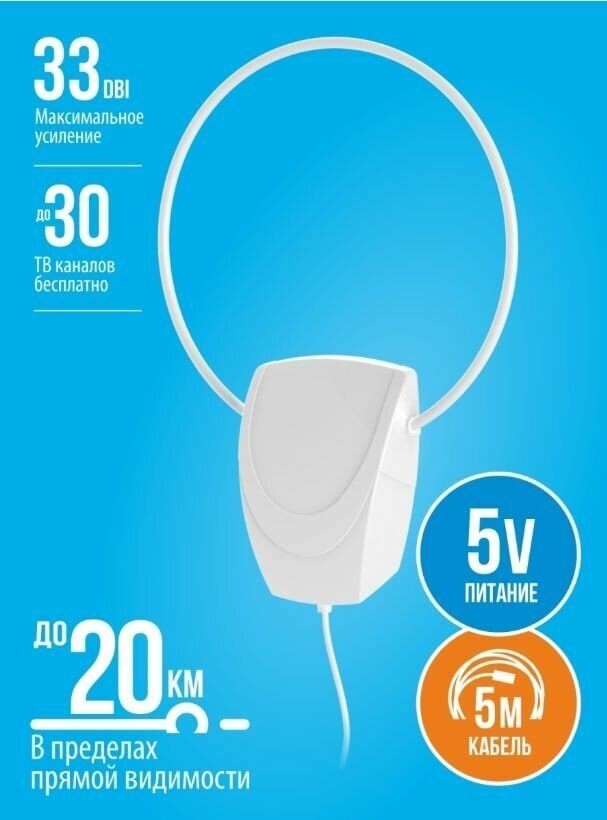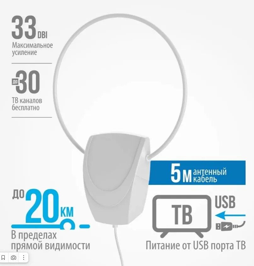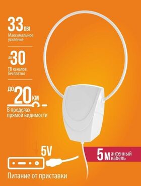 Недорогая, комнатная активная ТВ антенна РЭМО Иргиз BAS-5152 USB c кабелем 5 метров, обеспечит качественный приём цифрового телевидения DVB-T2 на ДМВ-каналах совместно с современным телевизором или цифровым приемником (тюнером). Антенна получает питание от TV приставки (ресивера) или от телевизора.