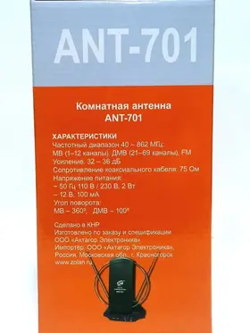 Встроенный усилитель с пониженным уровнем шумов оборудован коаксиальным входом для внешней антенны и имеет индикатор включения питания. Питание усилителя осуществляется от сети напряжением 220 вольт. Коаксиальный кабель антенны имеет достаточную длину (1,2 метра) и позволяет размещать «ZOLAN ANT-701» в точке наилучшего приёма телевизионных и радиопередающих станций.