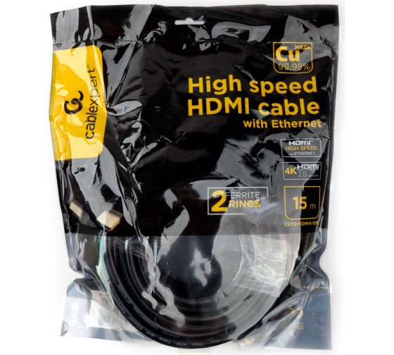Технические характеристики Cablexpert 15м v1.4 19M/19M черный позолоченные разъемы экран 2 ферритовых кольца пакет CCF2-HDMI4-15M