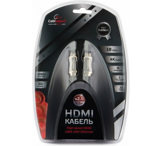 Технические характеристики Cablexpert HDMI 4.5 м v2.0 M/M позол.разъемы титановый металлический корпус CC-P-HDMI03-4.5M
