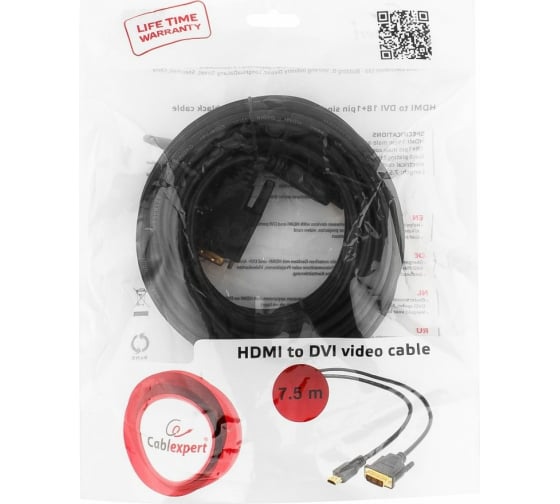 Дополнительные характеристики кабеля Cablexpert HDMI-DVI 19M/19M 7.5м singlelink черный, позолоченные разъемы, экран CC-HDMI-DVI-7.5MC: