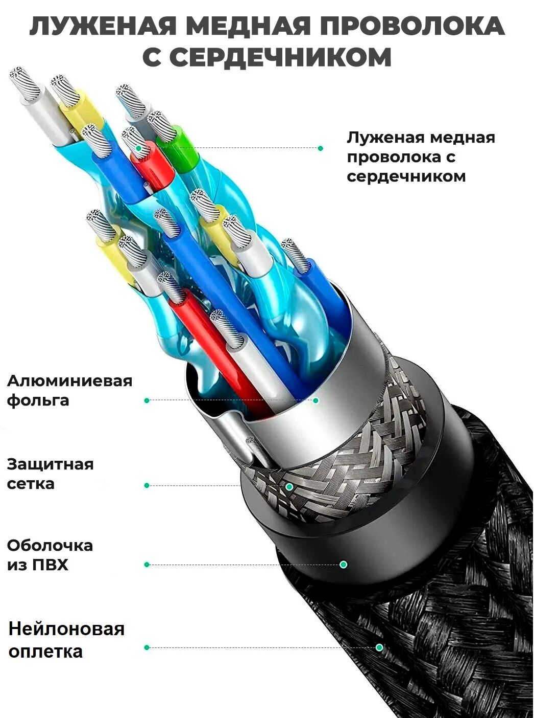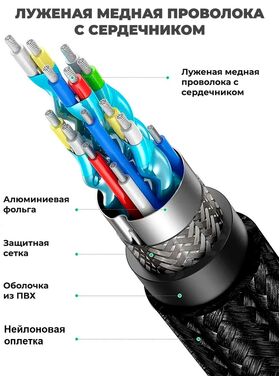 Аксессуар выполнен в прочной текстильной оплетке, отличающейся стойкостью к истиранию. Выдерживает свыше 10000 изгибаний. Шнур не подвержен скручиванию, что делает срок службы изделия долгим, а эксплуатацию - удобной.