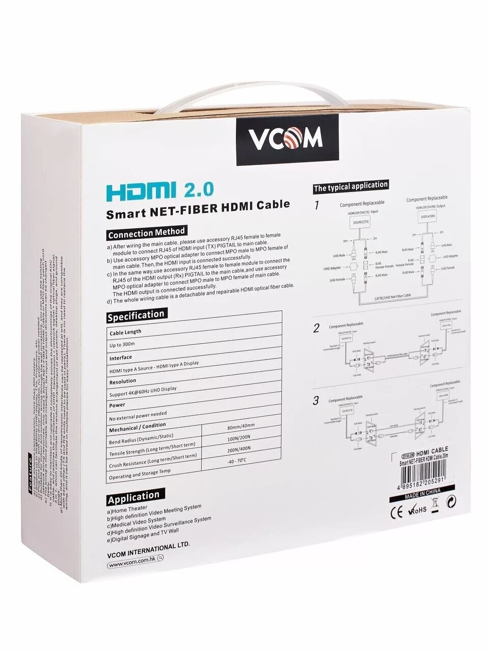 Оптическая система для соединения удаленного источника сигнала HDMI 2.0 с телевизором, проектором или монитором. Кабельная система состоит из основного кабеля, укладываемого в стене или кабельном канале, двух розеток и двух коротких кабелей, соединяющих устройства с розеткой. Возможна замена коротких кабелей с интерфейсом HDMI 2.0 на приобретаемые отдельно кабели с интерфейсами DisplayPort 1.4 или 2.0
